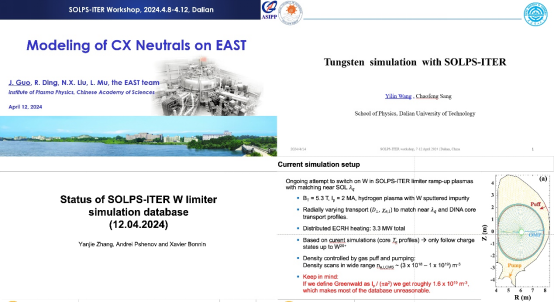 针对SOLPS-ITER的相关模拟进展,中国科学院等离子体物理研究所的郭晋博士做了名为《Modeling of CX Neutrals on EAST》的报告,大连理工大学的博士生王艺霖和张彦杰分别做了名为《Tungsten simulation with SOLPS-ITER》和《Status of SOLPS-TER W limiter simulation database》的报告,大家针对报告进行了热烈的讨论和交流。