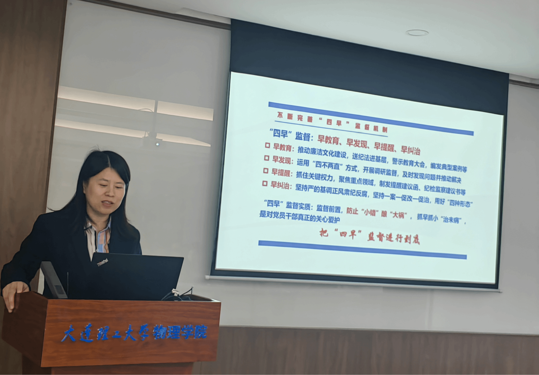 为贯彻落实党纪学习教育,进一步向基层党组织普及相关法纪法规,加强基层党组织的政治建设,大连理工大学纪检监察机构于2024年4月25日下午2:00在MK(中国)一站式服务官网322室成功举办“送纪法进MK(中国)一站式服务官网”主题讲座,本次讲座由MK(中国)一站式服务官网党委副书记于艳敏同志主持,学院党委委员、纪委委员和各党支部代表参会;大连理工大学纪检监察机构副主任孟秀英同志作为主讲人,为参会人员讲授一场生动的纪法学习党课。