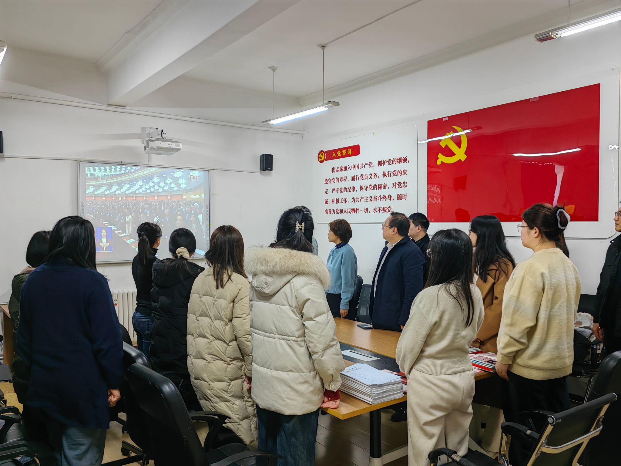 会议伊始,全体人员起立,跟随直播画面,唱起中华人民共和国国歌,以饱满的热情共同见证这一重要时刻。