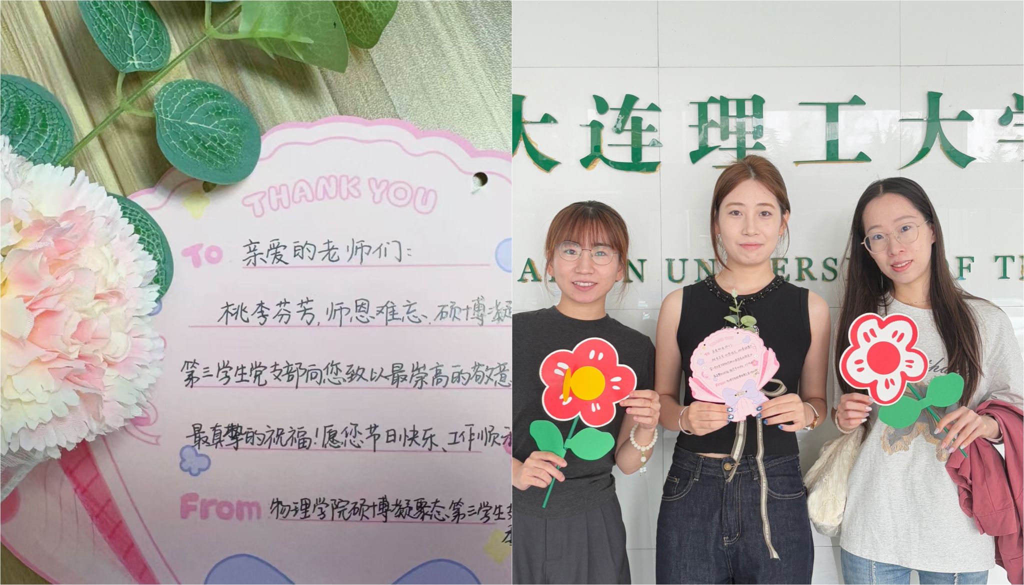硕博凝聚态第三学生党支部以一束盛开的鲜花为意象,制作了精美的贺卡,寓意春风化雨、桃李芬芳。花束承载着敬意与祝福,象征教师如园丁般辛勤耕耘、静待花开,寄托了对老师们最真挚的感恩与敬意。