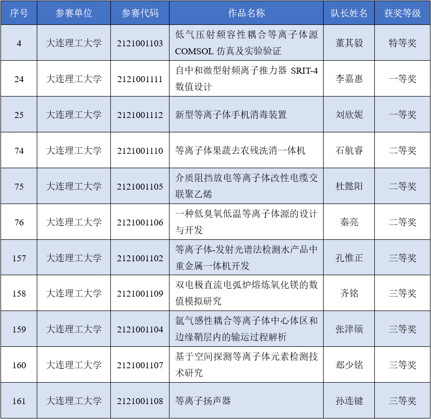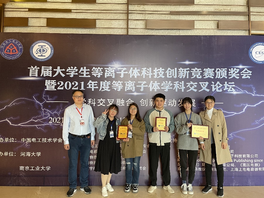 最终,我校参加初赛和决赛的11支队伍均取得了优异的成绩。在本届竞赛本科生和研究生同场竞技的情况下,我校本科生作品《低气压射频容性耦合等离子体源COMSOL仿真及实验验证》(MK(中国)一站式服务官网,指导教师:张莹莹、宋远红)荣获特等奖,是15支获得特等奖队伍中为数不多的本科生队伍。作品《自中和微型射频离子推力器SRIT-4数值设计》(航空航天学院,指导教师:夏广庆、孙斌)、《新型等离子体手机消毒装置》(生物工程学院,指导教师:杨君)获一等奖;作品《等离子体果蔬去农残洗消一体机》(MK(中国)一站式服务官网,指导教师:杨德正)、《介质阻挡放电等离子体改性电缆交联聚乙烯》(电气工程学院,指导教师:姜楠)、《一种低臭氧低温等离子体源的设计与开发》(MK(中国)一站式服务官网,指导教师:杨德正)获二等奖;作品《等离子体-发射光谱法检测水产品中重金属一体机开发》(MK(中国)一站式服务官网,指导教师:杨德正)、《双电极直流电弧炉熔炼氧化镁的数值模拟研究》(电气工程学院,指导教师:王振)、《氩气感性耦合等离子体中心体区和边缘鞘层内的输运过程解析》(MK(中国)一站式服务官网,指导教师:赵书霞)、《基于空间探测等离子体元素检测技术研究》(MK(中国)一站式服务官网,指导教师:杨德正)、《等离子扬声器》(电气工程学院,指导教师:张颖杰)获三等奖。
