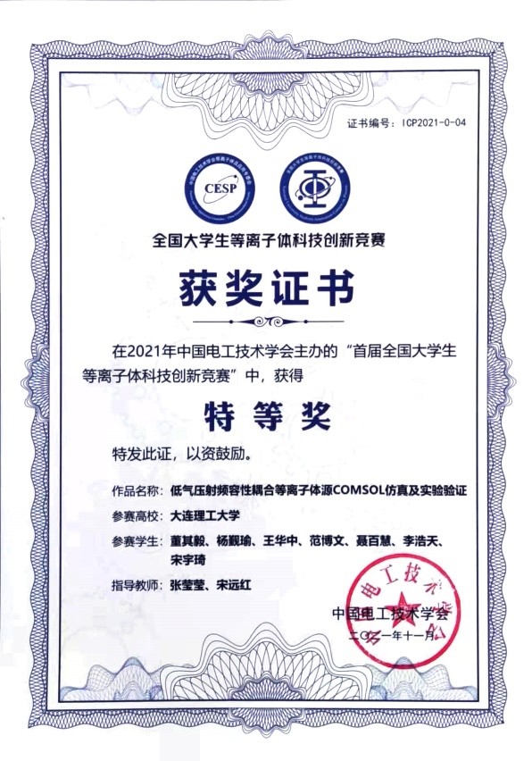 2021年12月12日,由中国电工技术学会主办,河海大学、南京工业大学共同承办的首届全国大学生等离子体科技创新竞赛落下帷幕,大连理工大学参赛队伍获得竞赛特等奖1项、一等奖2项、二等奖3项、三等奖5项,同时我校获优秀组织单位奖。其中,MK(中国)一站式服务官网本科生董其毅等同学共同完成的作品《低气压射频容性耦合等离子体源COMSOL仿真及实验验证》(指导教师:张莹莹、宋远红)荣获特等奖。
