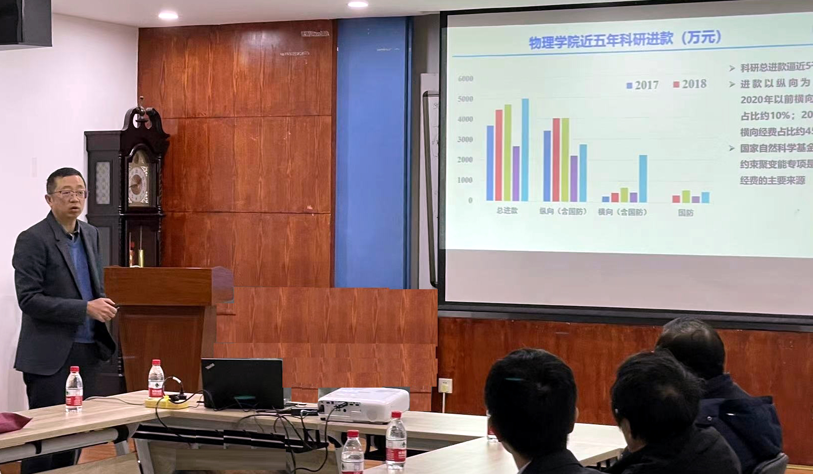 院长赵纪军汇报落实人事制度改革的具体工作思路,介绍了物理学科的现状与目标定位,强调了人才培养和科学研究两大根本任务,分析了近五年学院科研的总体情况,并对学院拟定的考核目标进行了详细解读,明确指出要通过制度改革创新,打破“大锅饭”,努力激发教师内生动力,全力支持青年人才成长,加强人才引进和师资队伍建设,推进学科建设规划。他提出,一要进一步完善聘期考核方案,激活“休眠型”教师,实现合理的淘汰制度;二要进一步加强大学物理教学师资队伍建设,完善物理学科拔尖人才培养机制;三要进一步凝练方向、整合队伍,推进十四五期间学科平台建设规划;四要进一步总结党建标杆院系经验,推动党建和事业发展深度融合。