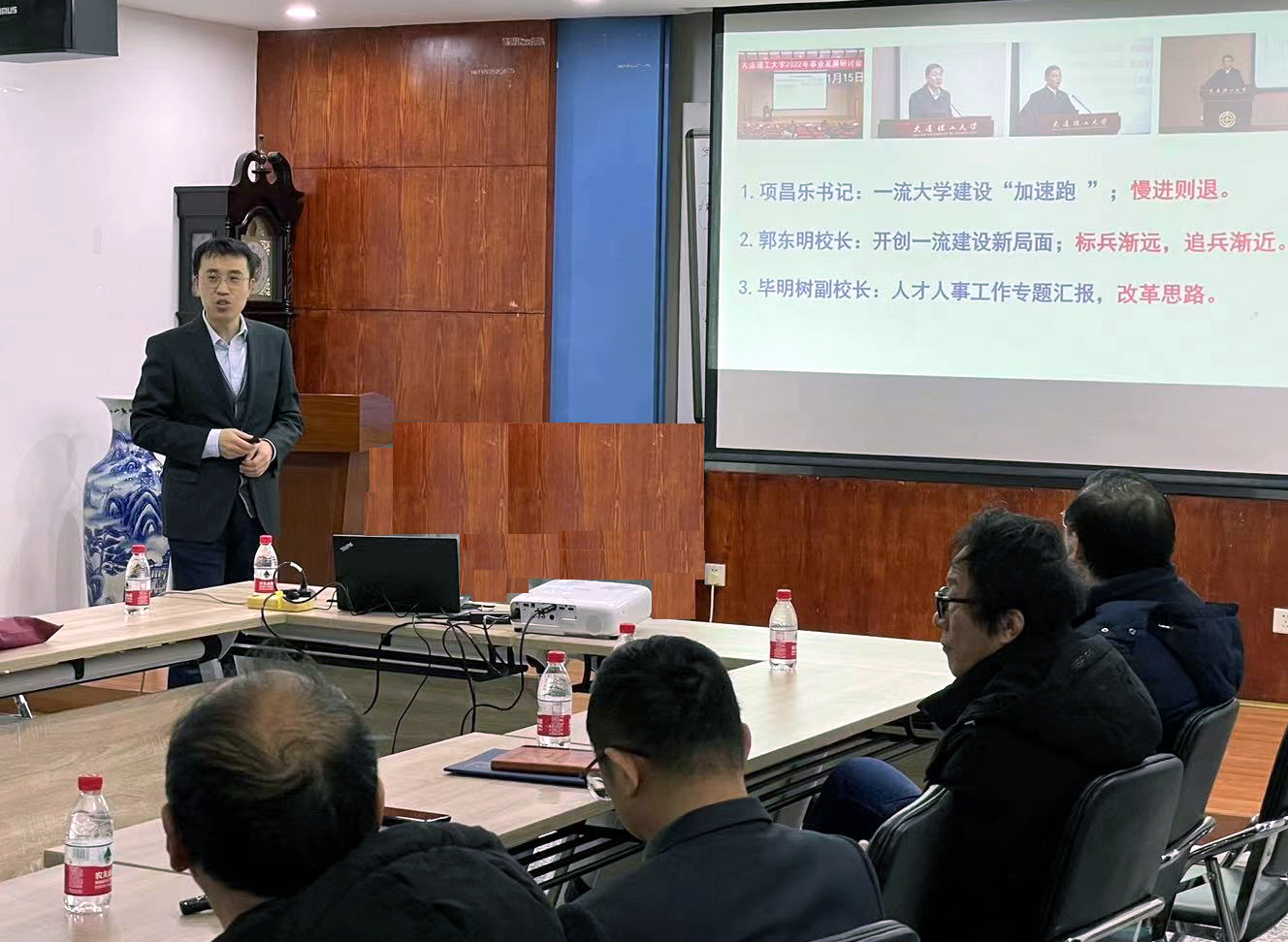 学院党委书记王正汹传达了学校事业发展研讨会上的讲话精神,对校党委书记项昌乐、校长郭东明、副校长毕明树在学校会议上的报告进行了解读。他要求全体教师深入了解学院现状和目标定位,围绕考核目标,确立明确的目标和方向,全体老师凝心聚力,充分调动工作积极性,努力推动学校的双一流建设。