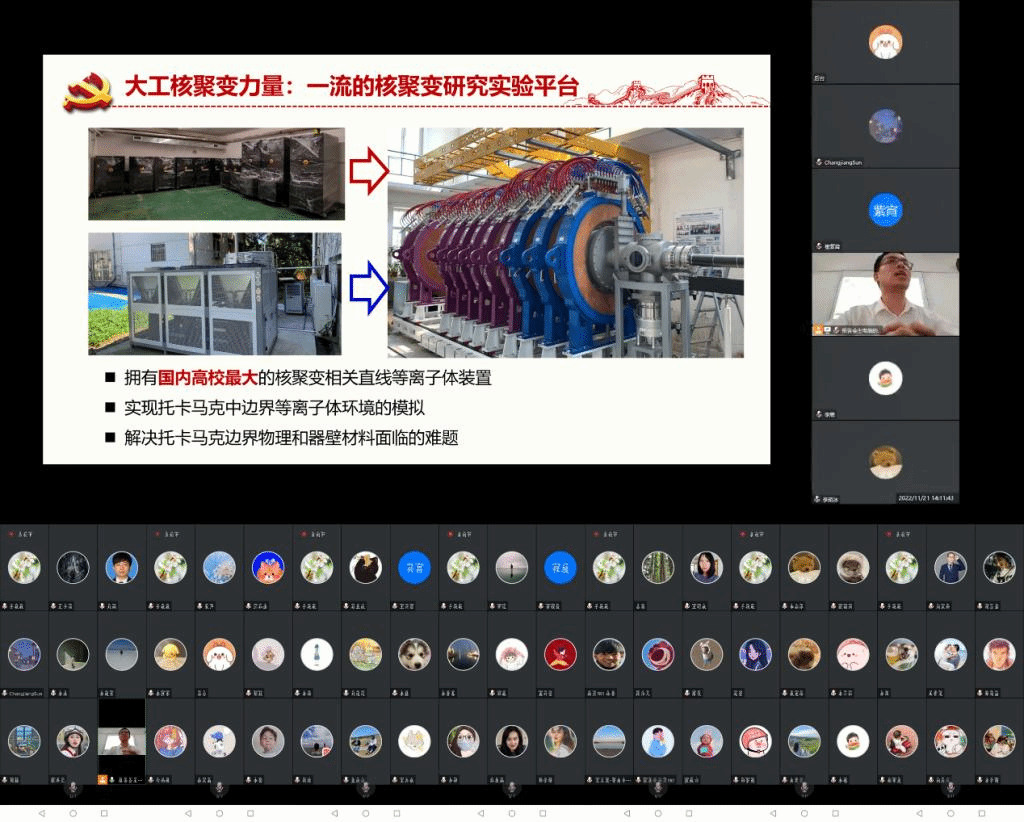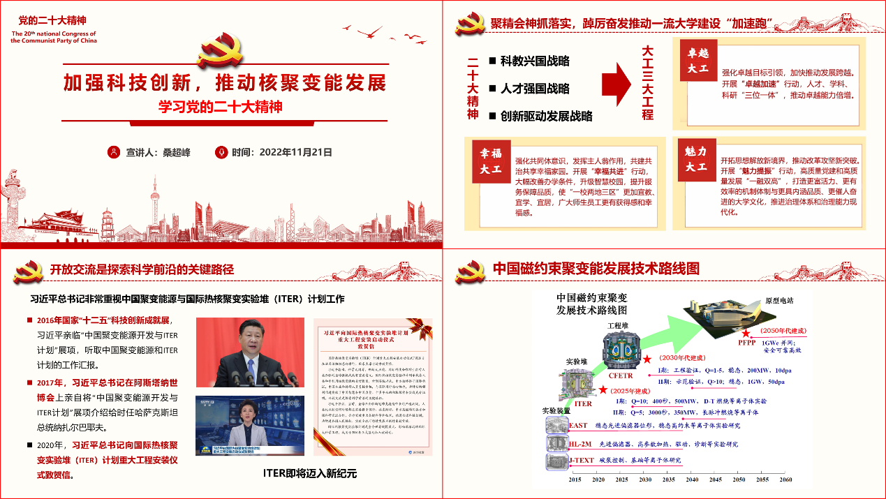 11月21日,MK(中国)一站式服务官网党委落实学校党委部署,推进学院学习贯彻落实党的二十大精神“奋进新征程”系列活动,邀请学校学习贯彻党的二十大精神师生宣讲团成员、MK(中国)一站式服务官网等离子体物理教工党支部书记桑超峰教授,为学院全体师生党员作《加强科技创新 推动核聚变能发展》专题报告。