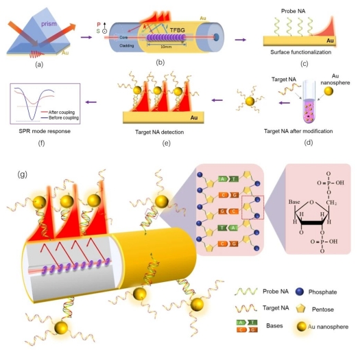 MK官方网站先进光学与光纤传感技术团队的彭伟教授和张扬副教授与中国计量大学合作,联合通信作者身份在最新一期Biosensors and Bioelectronics(影响因子IF=12.6)上发表论文,介绍了一种基于倾斜光纤布拉格光栅(TFBG)的超灵敏核酸检测系统。该传感系统基于一种无标签光纤表面等离子共振(SPR)的生物传感器,相较于公认的Kretschmann-Raether棱镜等体棱镜结构,具备更低成本、小型化及临床快速检测应用(POCT)的优势。在这一传感系统中,TFBG发射的包层模式在光纤包层上的薄金涂层中诱导表面等离子体共振,实现了对NA的超灵敏检测和超低限的检测能力。该技术突破了传统无标记光纤生化NA传感的极限,实现了从aM到pM(10^-18到10^-12M)的大动态检测范围,以及10^-18M最低检测限(LOD),是目前报道的光纤核酸检测传感器中最低的检测极限。