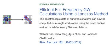 我院高威帷副教授、赵纪军教授以及德州大学奥斯汀分校James R. Chelikowsky教授,在Physical Review Letters上发表重要工作《Efficient Full-Frequency GW Calculations Using a Lanczos Method》(Lanczos加速的高效全频率GW计算),被选为编辑推荐工作。