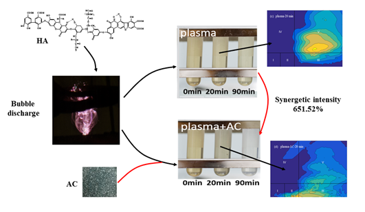MK(中国)一站式服务官网高压放电等离子体研究团队长期致力于大气压低温等离子体源和应用技术研究,研究团队提出了脉冲激励气泡放电等离子体-活性炭联用技术高效去除水体中的腐植酸。该项技术中,高压脉冲放电过程中产生的高能电子e和•O、O3等氧化性物质能充分接触并改性活性炭,以产生较高的协同效率,从而增加其对腐植酸和O3、H2O2等活性粒子的吸附和降解;同时,该联用体系还能将O3、H2O2等活性粒子转化为高氧化还原电位的•OH (1.89-2.72 V),促进吸附在活性炭表面腐植酸的降解。该项技术中等离子体和活性炭在降解水体中有机物的协同效率高达651.52%,腐植酸去除效率接近100%,且活性炭表面吸附残留腐植酸量仅为4.52%。此外,还揭示了等离子体活化含活性炭水原位净化污染水源的能力。