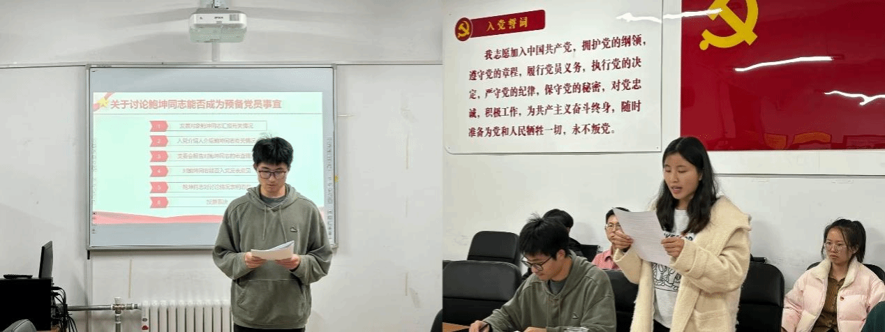 大会第一项,与会党员就发展对象鲍坤同志入党事宜进行讨论和表决。首先,鲍坤同志宣读入党志愿书,将自己的个人情况向大会作出汇报,表明个人入党动机、介绍自身思想政治情况、阐明未来发展规划。随后,由入党介绍人对该同志的主要表现进行说明,并对其是否同意接收鲍坤同志为中共预备党员表明态度。接下来,组织委员刘卓琪同志代表支委会向大会报告了鲍坤同志的政治审查情况、征求党员和群众意见的情况。接下来,与会党员对该同志的日常表现发表观点。最后,经过充分讨论和无记名投票表决,大家一致同意接收鲍坤同志为中共预备党员。
