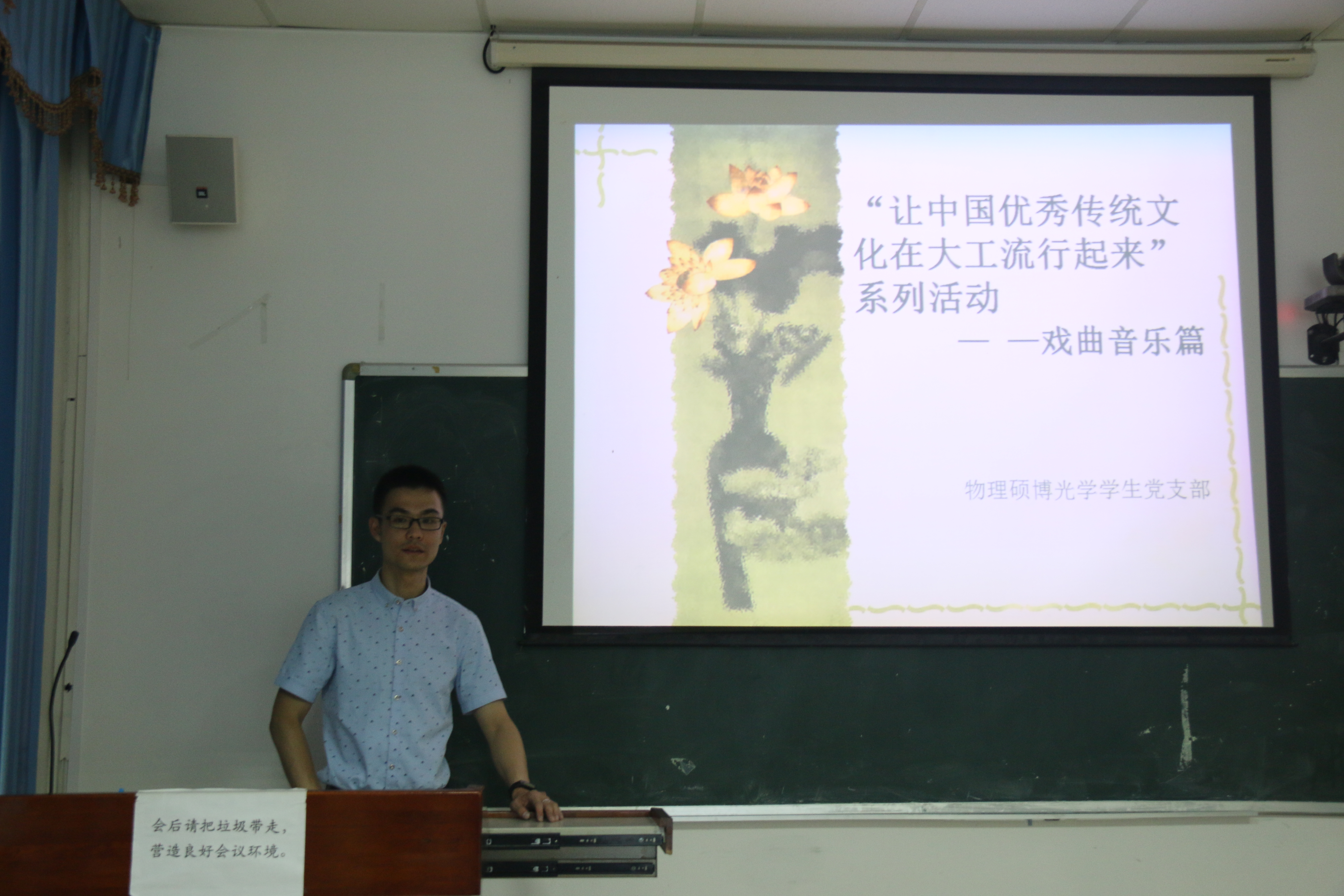 现在的音乐类综艺节目席卷各大电视台,流行音乐文化“热火朝天”,来自西方的音乐也引起了更多地关注。而且如今学习西方乐器的人越来越多,学习中国传统乐器的人则越来越少,很多人对中国乐器都叫不出名字或者分辨不清。中国戏曲的情况更是糟糕。戏曲音乐作为我国传统文化中不可或缺的一部分,更应该得到重视与保护。因此2017年6月6日晚,物理硕博光学学生党支部在物理系楼425举办了“让中国优秀传统文化在大工流行起来”系列活动第三部分——戏曲音乐篇。