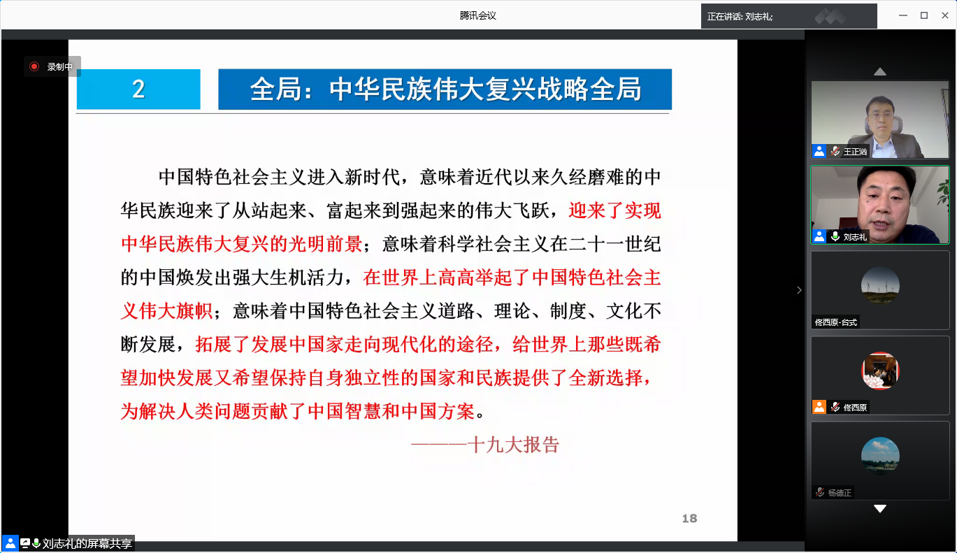 刘志礼教授以《奋力谱写全面建设社会主义现代化国家新篇章——学习十九届五中全会精神》为讲座主题,围绕全会的召开背景,“决议”的逻辑结构、基本内容和主要特征,全会的重大意义等三个方面,从国内外形势分析、报告词频分析等角度,细致、专业地展开宣讲。刘教授谈到:党的十九届五中全会深入分析世界百年未有之大变局、中华民族伟大复兴全局,提出我国转向高质量发展阶段的战略布局和发展格局,审议通过了《中共中央关于制定国民经济和社会发展第十四个五年规划和二〇三五年远景目标的建议》,提出了到二〇三五年基本实现社会主义现代化远景目标、“十四五”时期经济社会发展指导思想和必须遵循的原则,“十四五”时期经济社会发展主要目标等长远谋划,具有重大的历史性、全局性意义。