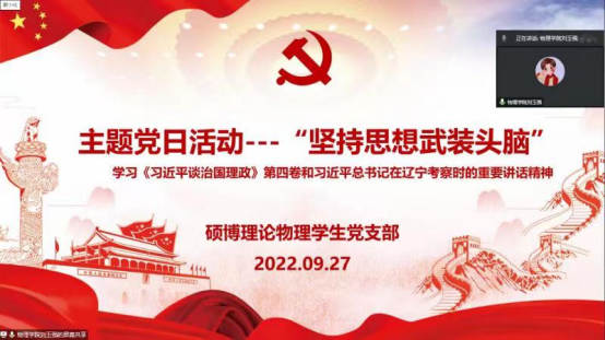 为了深入学习习近平总书记重要讲话重要指示精神,喜迎党的二十大胜利召开,进一步提高党员的党性修养,激励党员与群众满怀信心奋进新征程。2022年9月27日晚七点,硕博理论物理学生党支部以腾讯会议的形式开展“坚持思想武装头脑”主题党日活动。本次学习成员包括党员、发展对象、积极分子和部分群众,由支部书记刘玉强同志主持,主讲人为王诗瑶和闫宇两位同志。
