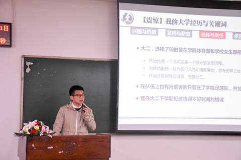 进行完大会第一项——全体起立奏唱团歌后,大会进入主要环节——四位优秀的学生标兵与团学成员进行经验分享。