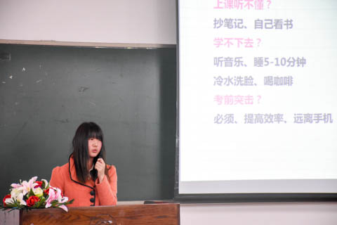 最后一位进行分享的是上银菁英学子奖学金的获得者李睿意。作为成绩前两名的学霸,她和同学们分享了自己的学习经验并且提出颇多提高学习成绩的方法——抄写笔记、潜心读书、合理利用时间、有问题及时解决……同学表示这些对自己的学习有很大的帮助,很感谢她的倾情分享。