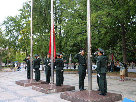 9月18日早6点20分,为纪念“九·一八”事变,物理与光电工程学院与管理与经济学部在音乐喷泉广场举行了“九·一八 勿忘国耻 振兴中华”主题升旗仪式。出席升旗仪式的是物理与光电工程学院和管理与经济学部的2015级新生,由国防教育学院的国防生担任升旗手。