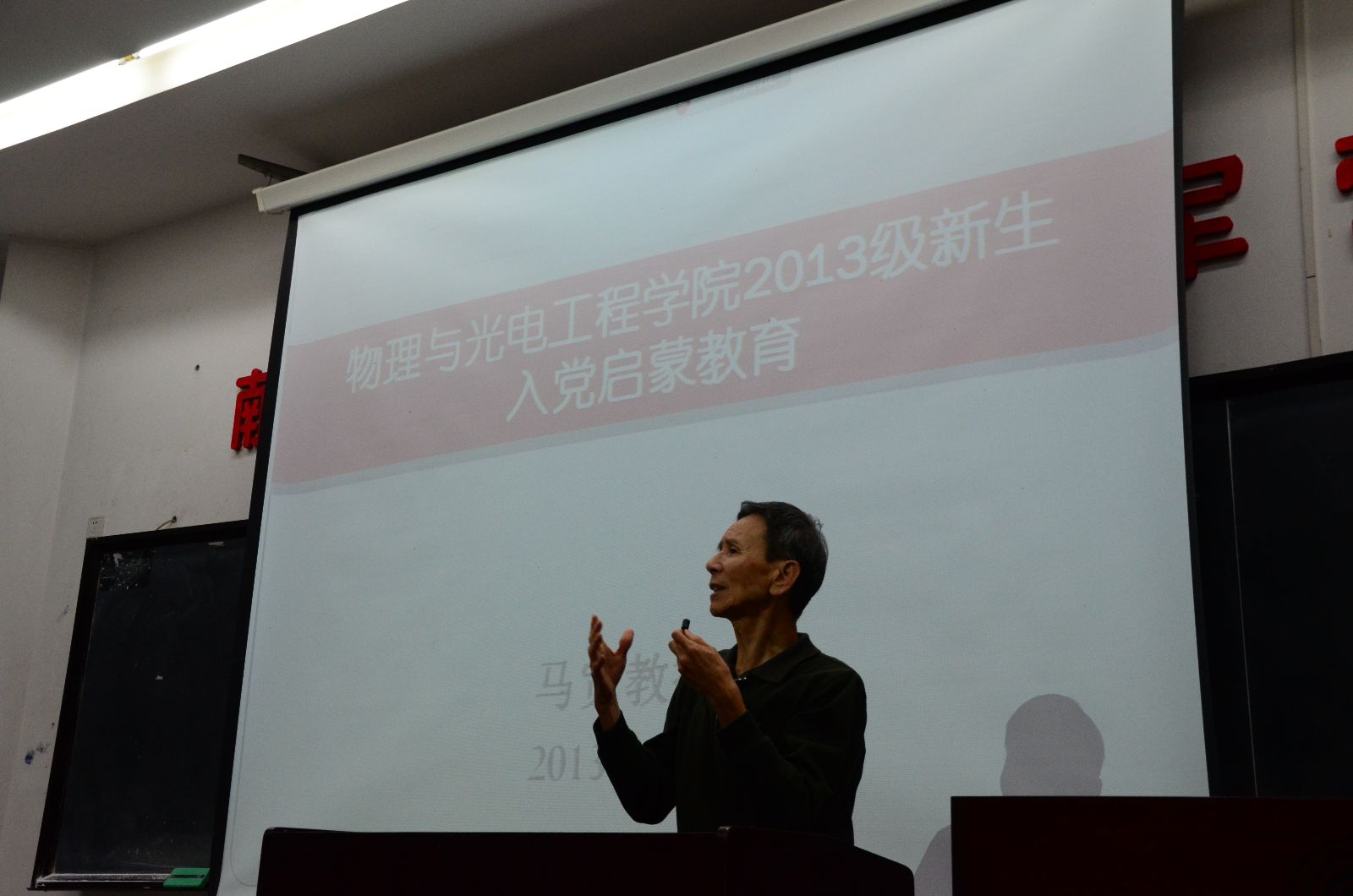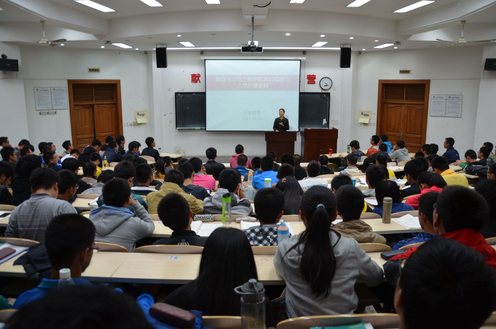 长期以来,入党启蒙教育一直是物理与光电工程学院新生入学教育的重要内容之一。10月14日,学院十分荣幸地邀请到了马宽教授,为MK(中国)一站式服务官网2013级全体学生开展入党启蒙教育。学院党委副书记兼副院长杨木老师,2013级辅导员俞洲老师出席了本次活动。