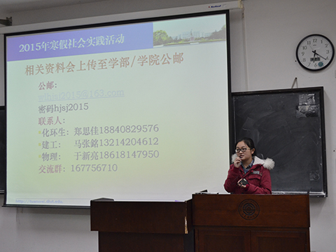12月26日晚,由化工与环境生命学部、建设工程学部和物理与光电工程学院团委实践部共同举办的寒假自主实践活动宣讲会在综合一号教学楼152教室顺利召开。来自三个学部学院的实践部部长和数十名学生参加了此次宣讲会。