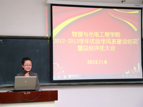 为营造良好学习氛围,激发同学们的学习热情。11月6日下午,物理与光电工程学院2012-2013学年优良学风班建设结项暨总结评优大会于建馆118教室顺利召开。物理与光电学院副院长周玲教授,学院党委副书记兼副院长杨木老师,原子与分子学科负责人丛书林教授,理论物理学科徐立昕副教授,微电子与固体物理学科刘艳红副教授,学院组织兼学生办公室主任李一鸣老师,学院团委书记佟西原老师出席大会并担任评委。本次大会有物理与光电工程学院10至12级队共19个班级参选。
