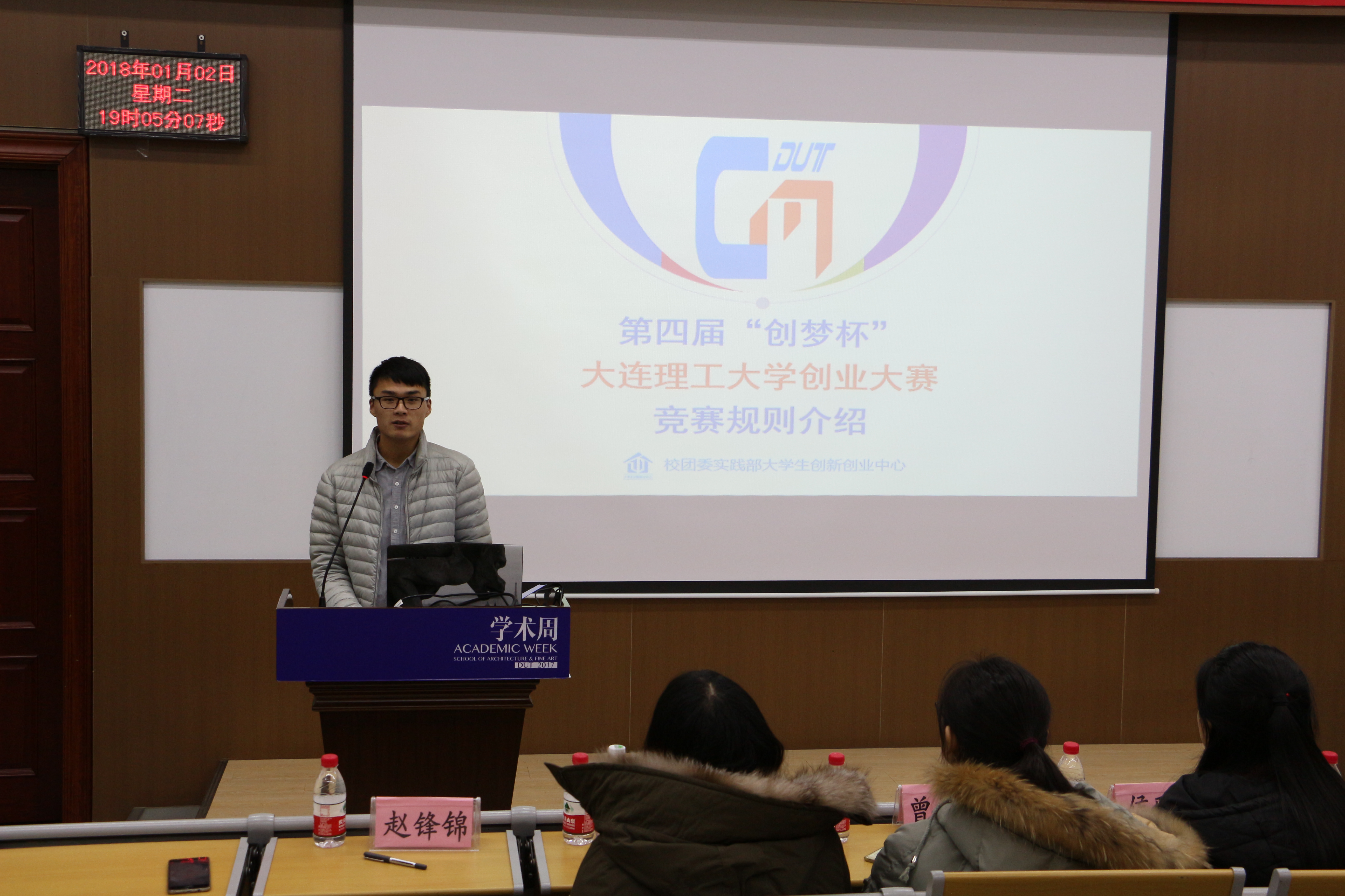 2018年1月2日晚6:30,由MK(中国)一站式服务官网和建筑与艺术学院联合举办的创梦杯宣讲会在第二教学馆309室举行,出席本次活动的嘉宾有校团委实践部大学生创新创业中心副主任赵锋锦,MK(中国)一站式服务官网科技实践部部长周滔,MK(中国)一站式服务官网科技实践部副部长乔家鑫,以及来自建筑与艺术学院和建艺科创部的马骁尧、曾译莹、侯雅洁等。