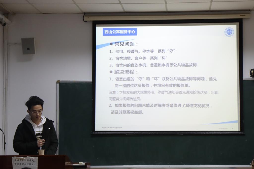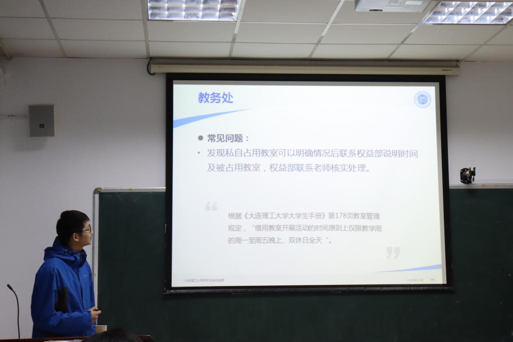 讲座开场,主讲人简明地向参会同学们介绍权益部各部门的主管人员及其联系方式,让同学们知道该到哪里维护权益,谁会帮我们维护权益等问题。接下来是李金航同学为我们介绍后勤处的相关知识,他强调了后勤处下设五个中心,分管公寓,供暖,交通,商贸,饮食这五个方面。同时他告知同学们其中食品安全问题与供暖问题与同学们的日常生活息息相关,当遇上供暖效果不佳或者食品混有异物等问题时都可以及时向权益部反映。志愿者孙梦娇向大家介绍资源管理部,网信中心以及图书馆三大智能处。她结合自身的经历,生动得阐明大家如何处理校园网缓慢与部分图书馆不文明行为等问题。随后志愿者姜春晖同学向我们介绍了保卫处、学生处、体育场馆中心这三方面。他先介绍保卫处的各个科室的职能,包括可以调录监控视频的治安科以及与公安局对接的接警处,他也介绍了学生处查寝的注意事项,同时警醒同学们不要使用违禁电器。最后由志愿者葛浩威同学为大家简单讲解教务处、校园管理与规划办公室、校医院的职能,他呼吁同学们当遇到相关问题时要积极与相关负责部门联系。至此,此次讲座圆满结束。