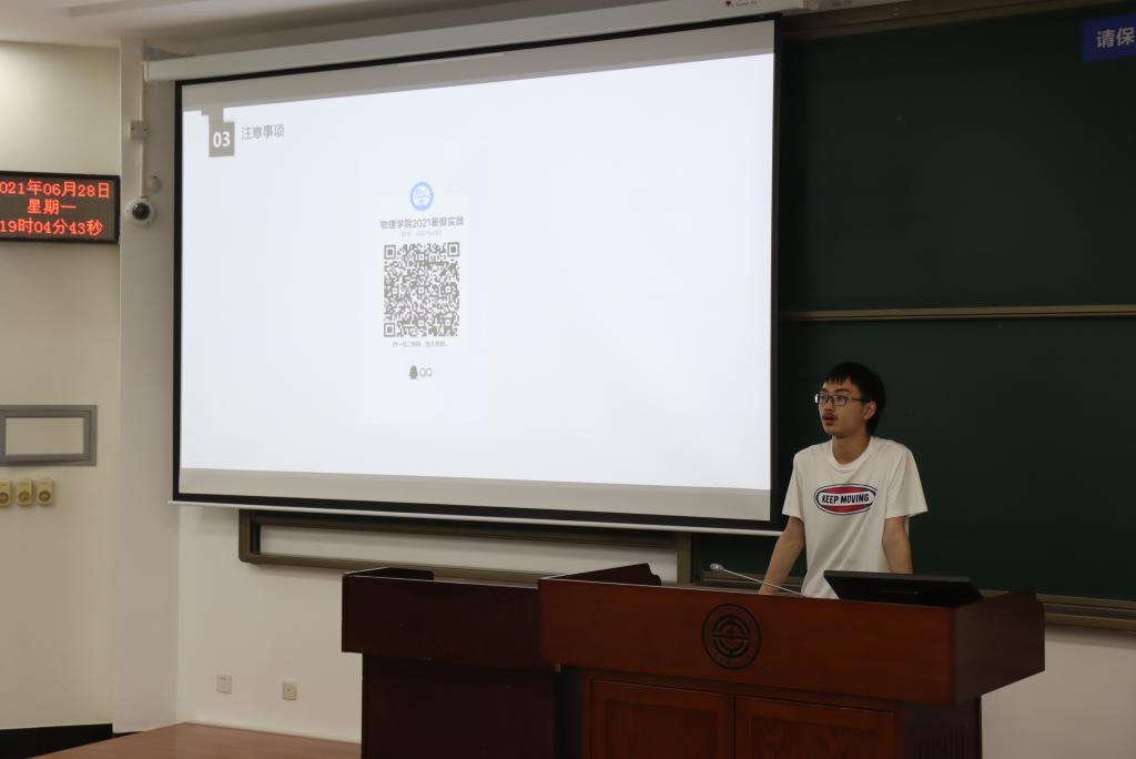 会议开始,邢静文同学首先介绍会议的各项注意事项。然后由韩振琦同学为大家介绍了具体的活动内容:第一步,校团委增设了校内实践环节,依托七一校园文化展各实践团需要到文化展位拍照打卡。第二步,校外实践环节,各实践团以实际行动祝建党百年,7条线路4大主题,包括“开天辟地-敢为人先红船精神-浙江路线”、“星星之火,可以燎原,井冈山-湘贛路线”等,还介绍了校外实践的四大主题,分别是“学党史,追寻红色足迹”、“悟思想,讲好中国故事”、“办实事,贡献青春力量”、“开新局,擘画宏伟蓝图”。在此之后,韩振琦还为同学们讲解了暑期实践活动立项的注意事项,包括立项,结项,评优等各种事件的基本流程,提醒同学们注意健康承诺书的撰写等。在最后,由郭沛同学为大家解决疑惑,讲解可能出现的问题,同学们踊跃提问,例如“是否可以跨院系组队”等问题,并都得到了准确详实的解答。
